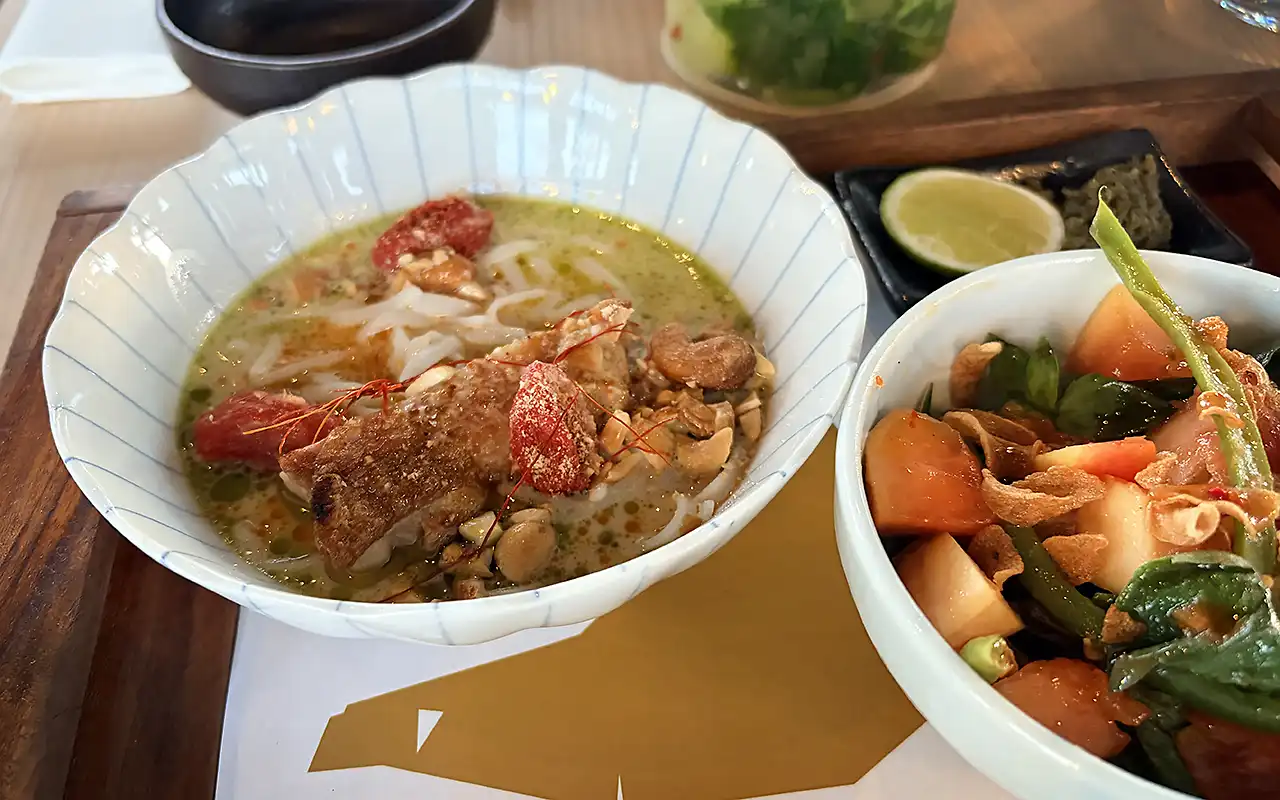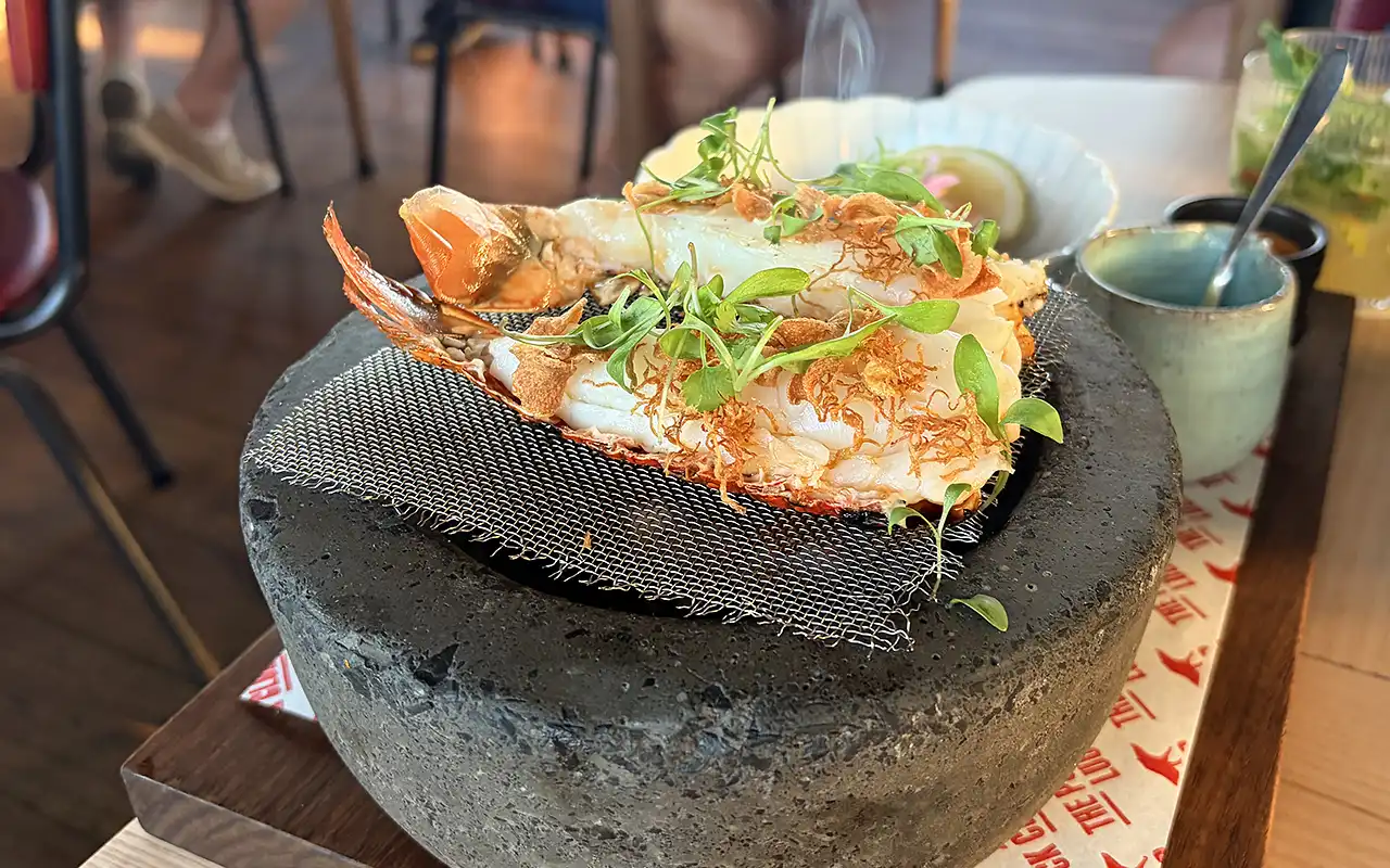 We ordered the Penang Pork Belly, Smoked Beef Fillet, Tom Kha Gai, Asian Pickled Salad, and the Mozambique langoustine tail as a special, arriving in a stone bowl hibachi.